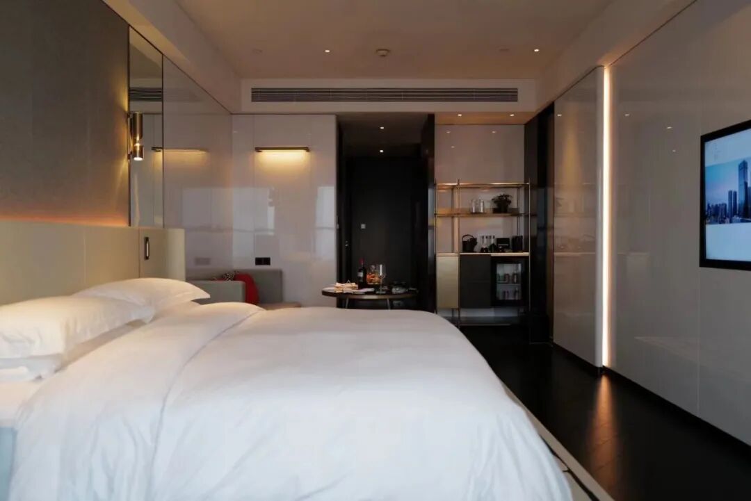 无论行程有多紧凑多疲惫,当我循着水流潺潺的镜面水池跨入酒店塔楼底部的入口;当电梯门在38层打开的刹那被绵延落地玻璃揽入的画卷般的城市美景点亮;当脚步塔在湖面般平整透亮的大理石地面上;当舒坦地靠坐在沙发上,边欣赏抽象展现川剧脸谱线条,边完成入住手续时。旅途中所期许的平静、悠然、稳妥总不免扑面而来。