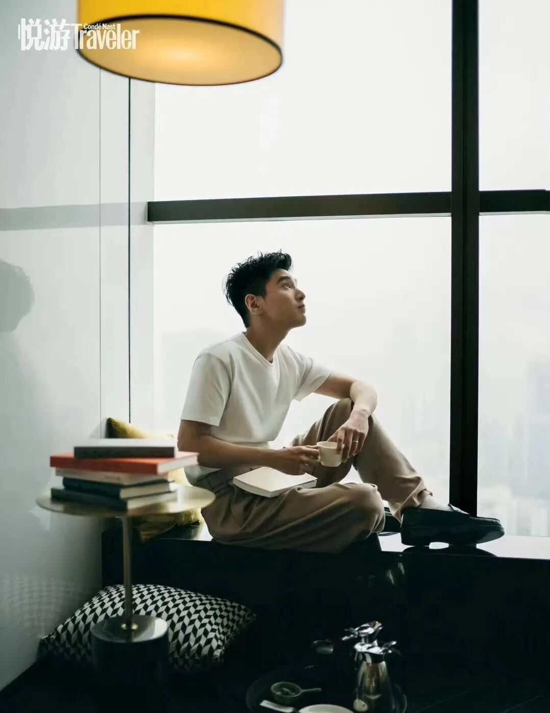 赵又廷在酒店客房内为权威旅行杂志《悦游Conde Nast Traveler》拍摄了大把大片(上图)。纯白烤漆镶板和金属质感的家具,把画面渲染得格外未来且安静。