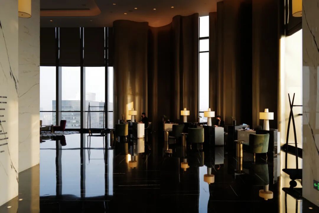 ▲ 38层空中大堂前台背后的黄铜屏风,既代表川剧脸谱线条的延伸,也隐喻了戏院的帷幕,美妙呼应了设计主创旨在表达的“人生如戏”的设计主题。