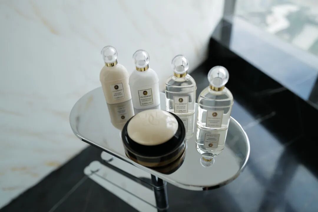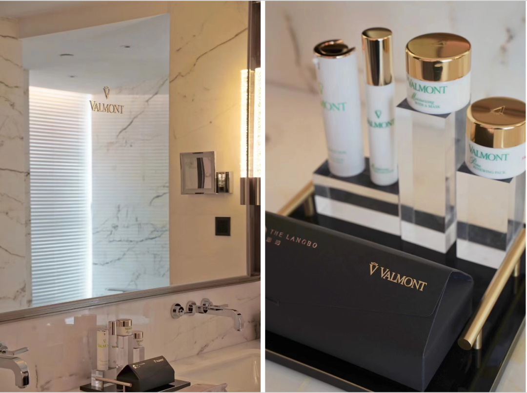 酒店的迎晖套房与瑞士护肤世家法儿曼(Valmont)进行了一场深度联名,除了在客房装饰和配置上融入Valmont的品牌精神和经典元素外,还将价值不菲的Valmont护理套装作为入住礼物赠予迎晖套房住客。
