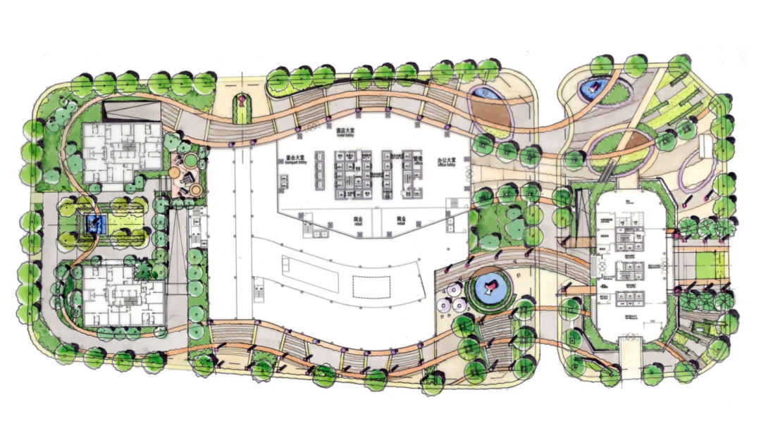 3. 建筑群采用了“悬浮”城市概念,打碎和架空底部空间,让人流能建筑底部感受到走街串巷的自在,促进建筑与周围社区的融合与互动。