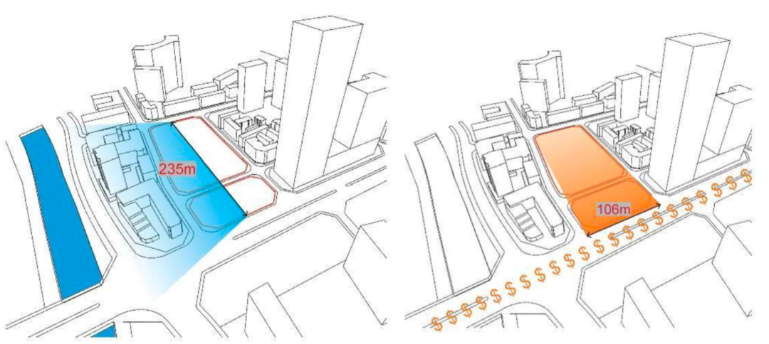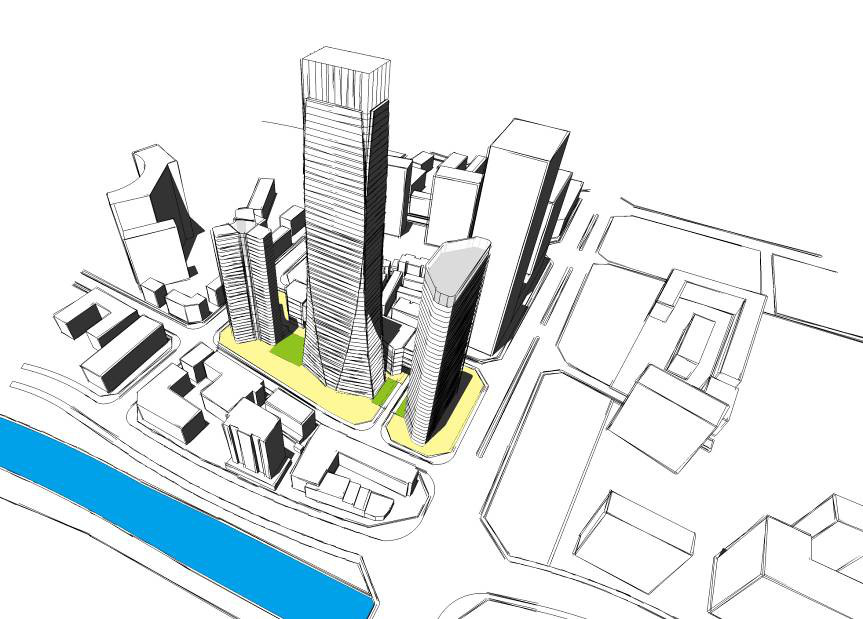 1. 在面东大街处设置中等高度的银行大厦、中部设置主塔、最深处设置住宅,令建筑排布更具韵律感;