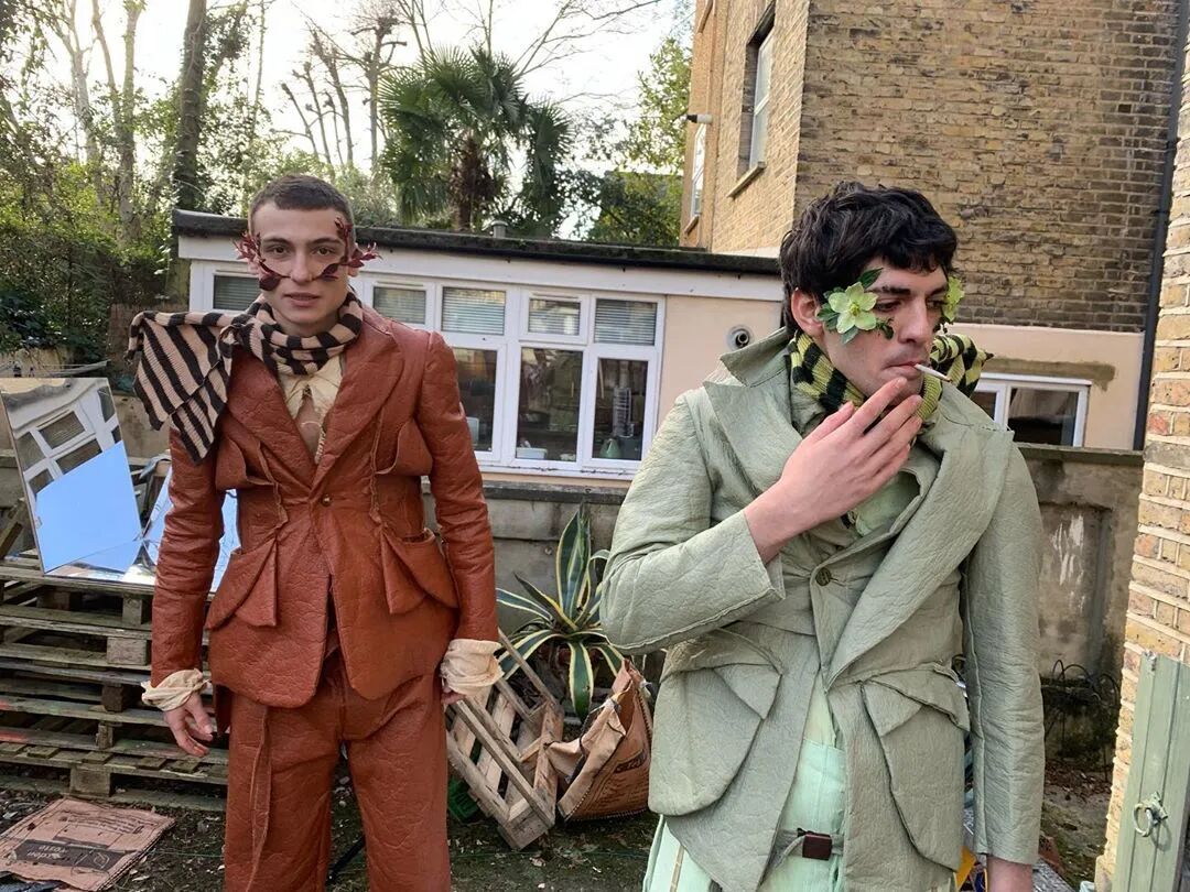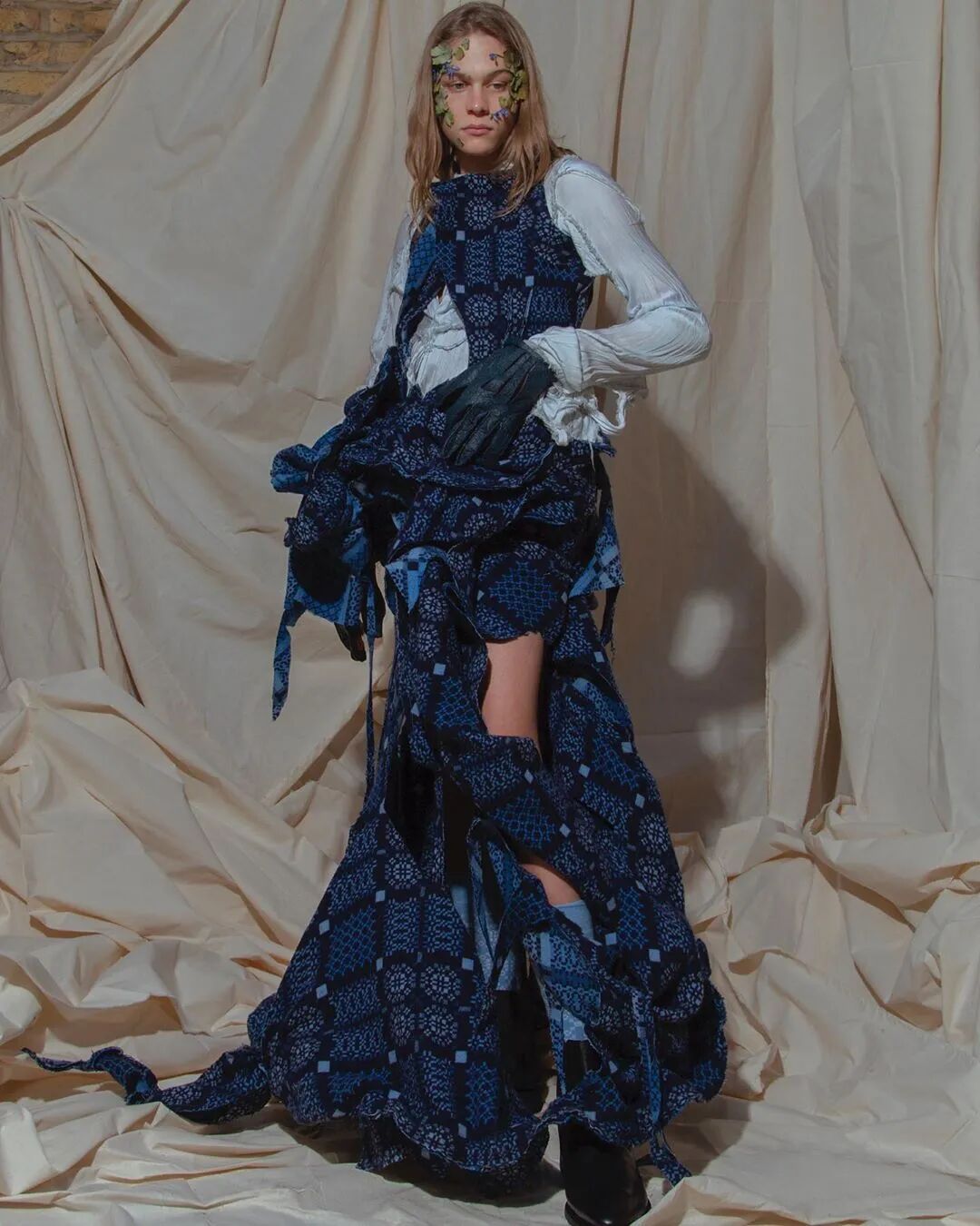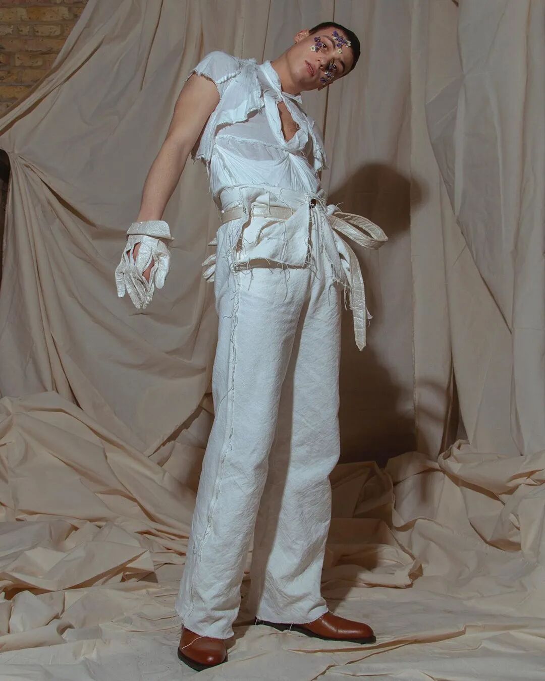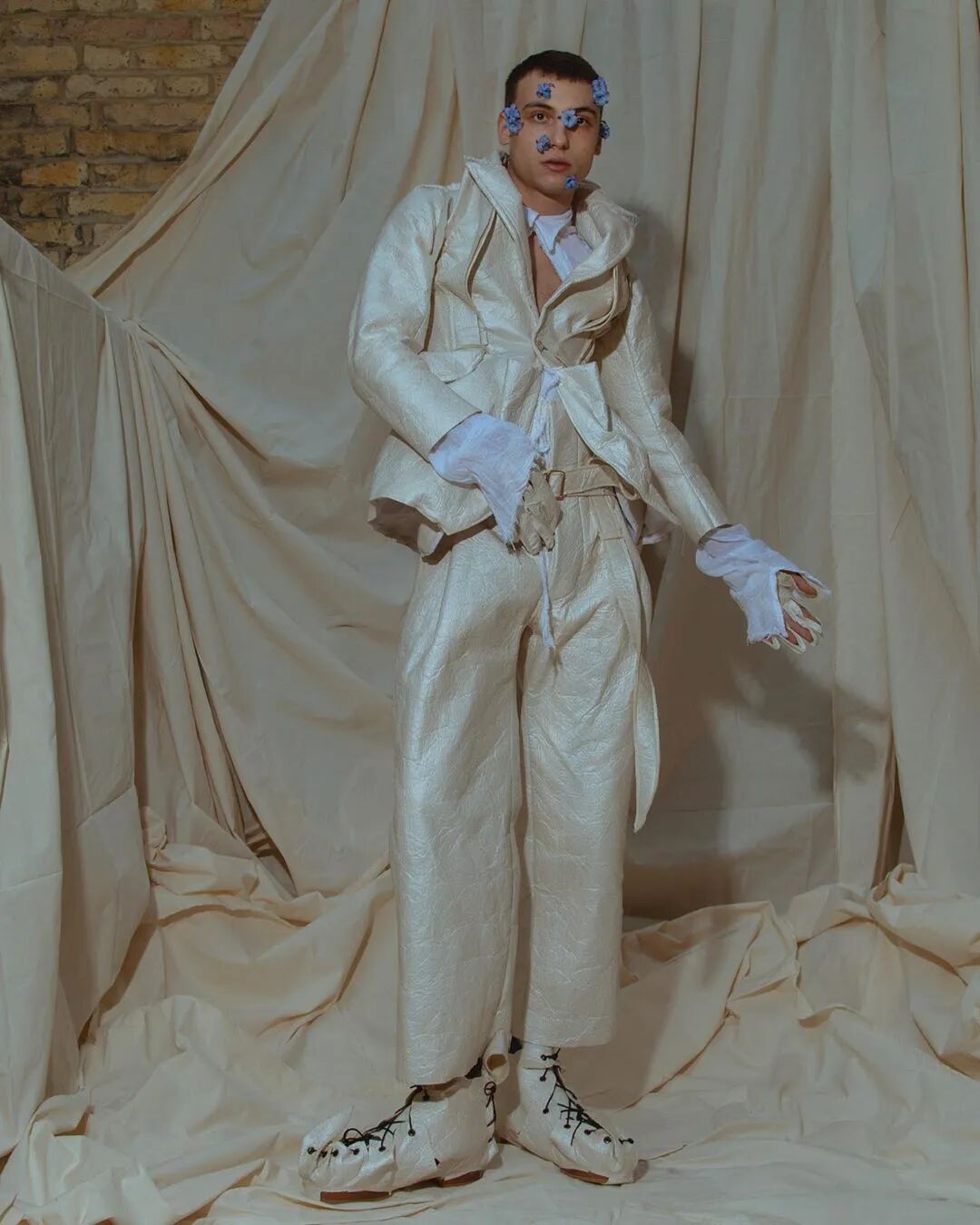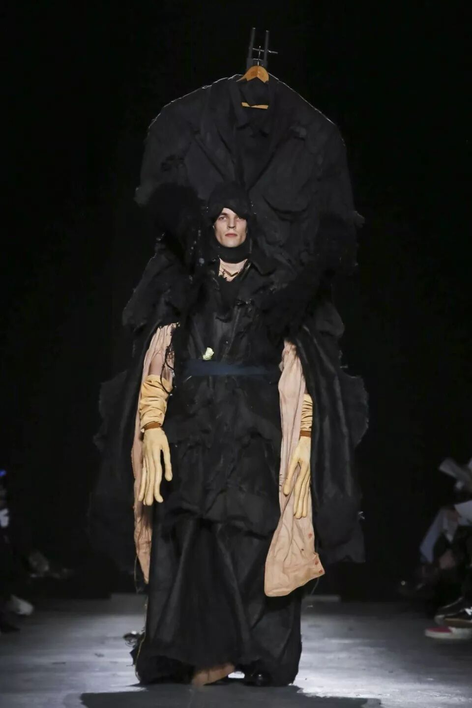 Paolo Carzana 的这一男装设计系列旨在凸显无性别主义理念,女性化的花卉妆容和柔和曲线的褶皱设计则进一步模糊了性别辨识,尽管充斥着诸多戏剧化的面貌,大部分造型的实用可穿着性还是得到了一定的重视。