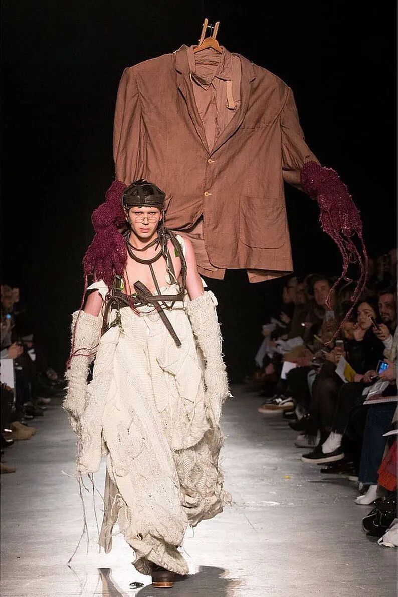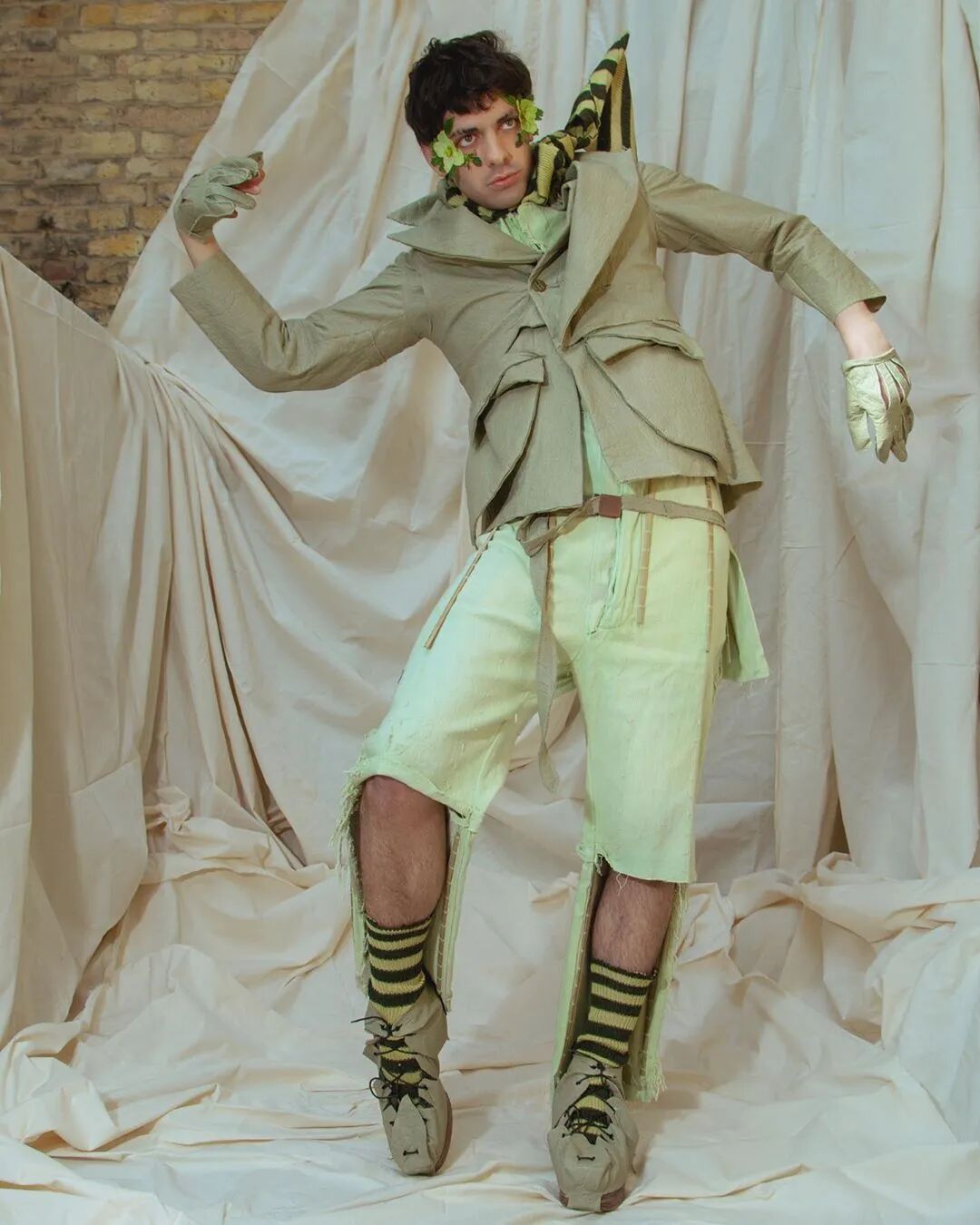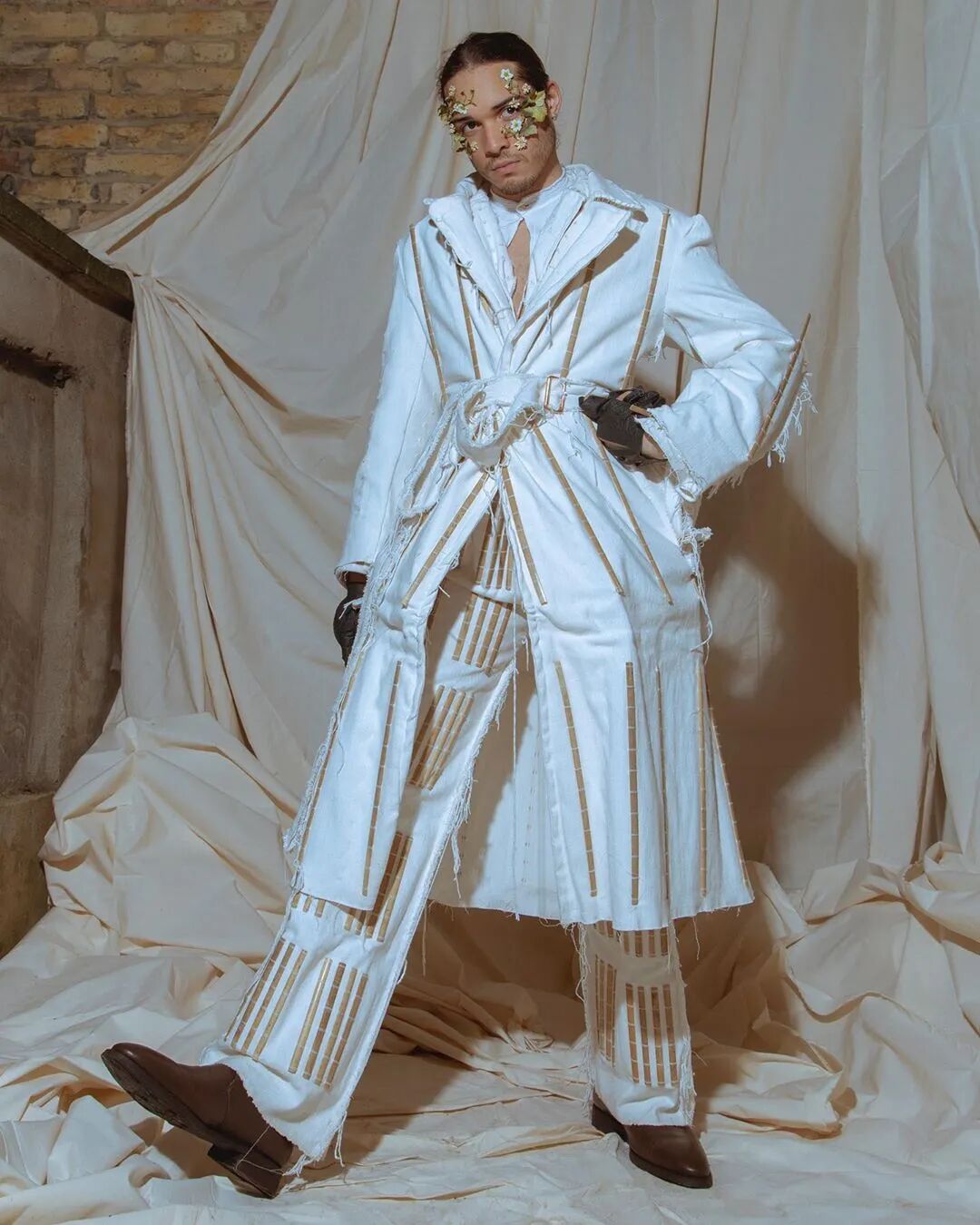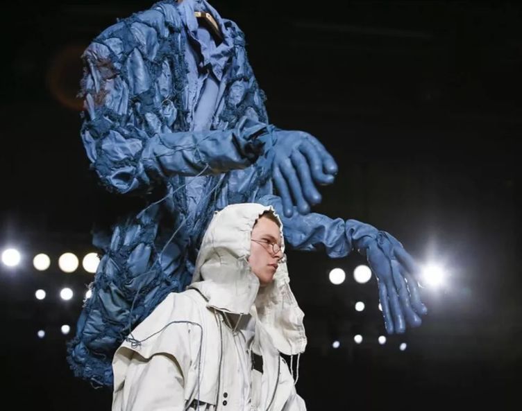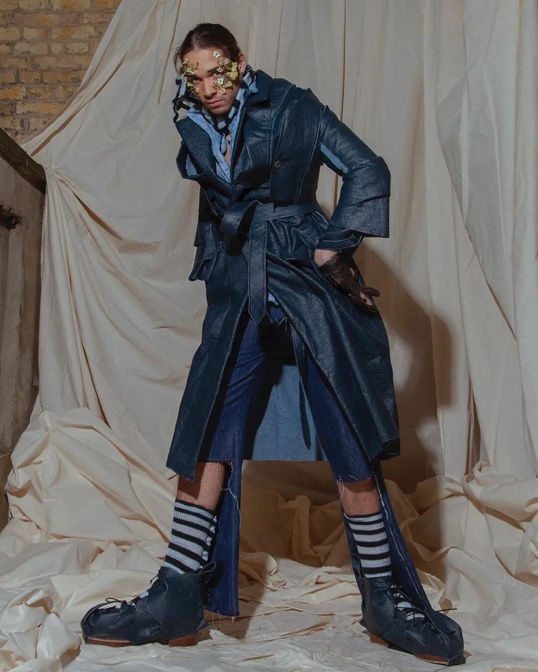 Paolo Carzana 的这一男装设计系列旨在凸显无性别主义理念,女性化的花卉妆容和柔和曲线的褶皱设计则进一步模糊了性别辨识,尽管充斥着诸多戏剧化的面貌,大部分造型的实用可穿着性还是得到了一定的重视。