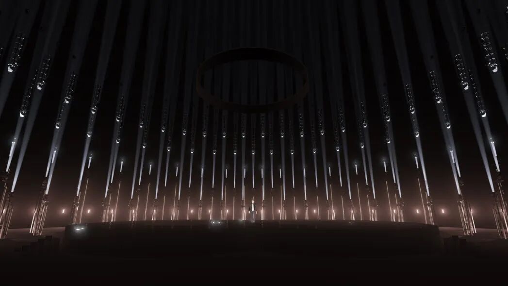 在舞台的正上方,灯光设计团队在“♾️”符号的两个圆的正上方设计了6个数控半圆,使用无极摇头效果灯、光束灯,在兼顾屏幕设计需求的同时,增加更多的灯光层次。