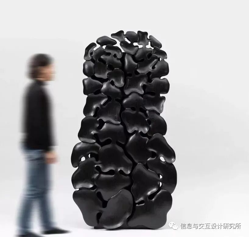 这套名为“无意识”的家具系列基于一个可作为托盘或单独摆件的独立形状,在设计好这些非常相似却不一样的形状之后, kim yun-hwan 决定将多个形状拼接到一起,创作出一个大型的异形结构,使其拥有橱柜门、坐具等形态。