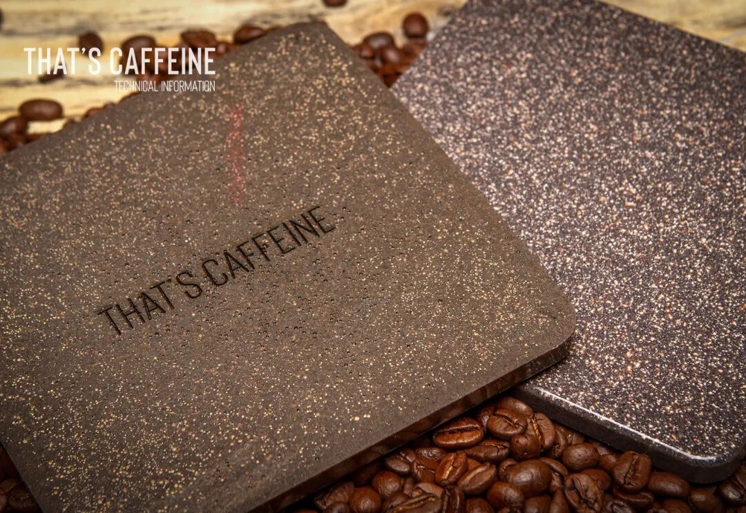 比如,由Atticus Durnell在伦敦手工制作的That's Caffeine是一种独特的生物基材料,由回收的咖啡渣制成,视觉和触感上都像花岗岩石。这种生物基材料是生物粘合剂、矿物质和植物树脂的复合材料,与同类材料相比,它的重量非常轻,材料具有可持续性和可生物降解性、防水和耐热性,并成功地将咖啡垃圾从垃圾填埋场转移,同时为产品带来表面光洁度和更丰富的颜色。