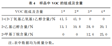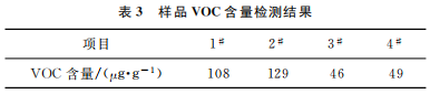 样品VOC含量检测结果见表3,样品中VOC的组成及含量见表4。结合表3—表4可知:生物基PVC表皮膜与石油基PVC表皮膜的VOC含量相差不大,2个样品VOC组成及含量基本相同;生物基PVC发泡膜与石油基PVC发泡膜的VOC含量几乎一致,所含物质含量相近但比例稍有变化。