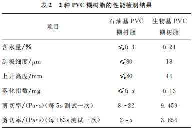 目前汽车内饰用PVC糊树脂使用的是石油基PVC糊树脂,2种PVC糊树脂的性能检测结果见表2。实验结果表明生物基PVC糊树脂的各项性能均满足汽车内饰用PVC糊树脂的标准要求。