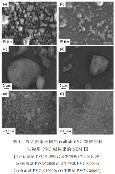 图1为放大倍率不同的石油基PVC糊树脂和生物基PVC糊树脂的SEM图。由图1(a)、1(c)、1(e)可以看出,石油基PVC糊树脂的初级粒子(在聚合过程中形成的最小分布单元)平均尺寸小于生物基PVC糊树脂,且分子更加立体、紧凑,粒径分布较窄。由图1(b)、1(d)、1(f)可以看出,生物基PVC糊树脂次级粒子(由初级粒子形成的团聚体)表面粗糙,颗粒平均尺寸明显小于石油基PVC糊树脂。