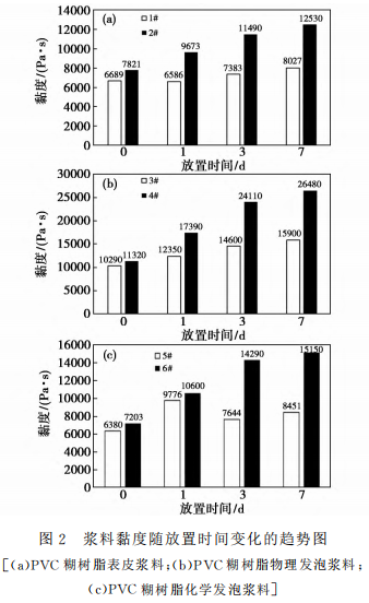 对配制的6种浆料黏度进行测试,浆料黏度随放置时间变化的趋势图见图2。由图可以看出:生物基PVC糊树脂浆料初始黏度与石油基PVC糊树脂浆料初始黏度大致相同;放置1d和7d后,PVC糊树脂物理发泡及化学发泡浆料黏度有了显著的提高,其中生物基PVC糊树脂浆料黏度超过了15000Pa·s。生物基PVC糊树脂浆料初始黏度高于石油基PVC糊树脂浆料,是因为石油基PVC糊树脂的次级粒子较多,体积较大,松散的初级粒子较少,粒子之间排列紧密。而生物基PVC糊树脂的初级粒子较多,次级粒子较少,容易与催化剂接触,束缚催化剂颗粒,因此浆料黏度较大。此外,生物基PVC糊树脂浆料放置1~7d后黏度增加较快,是因为石油基PVC糊树脂的次级粒子体积较大,崩解的速度较慢。生物基PVC糊树脂的次级粒子体积较小,更易散开,因此在后续的观测过程中,生物基PVC糊树脂的黏度增长速度更快。