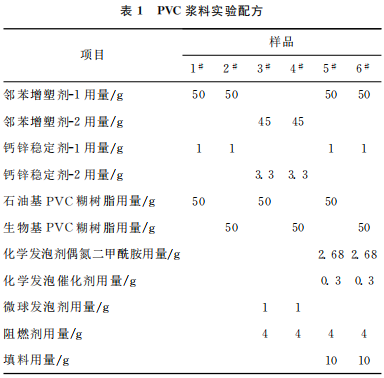 分别以普通石油基PVC糊树脂、生物基PVC糊树脂为原料,通过添加系列助剂配制了6种浆料(编号1#—6#),将浆料置于搅拌机以1500r/min速度搅拌10min,分别在190℃、200℃、210℃温度条件下烘烤1.5min,得到生物基PVC膜和普通石油基PVC膜。样品编号如下:1#:石油基PVC糊树脂表皮膜(简称石油基PVC表皮膜);2#:生物基PVC糊树脂表皮膜(简称生物基PVC表皮膜);3#:石油基PVC物理发泡膜;4#:生物基PVC物理发泡膜;5#:石油基PVC化学发泡膜;6#:生物基PVC化学发泡膜。PVC浆料实验配方见表1。