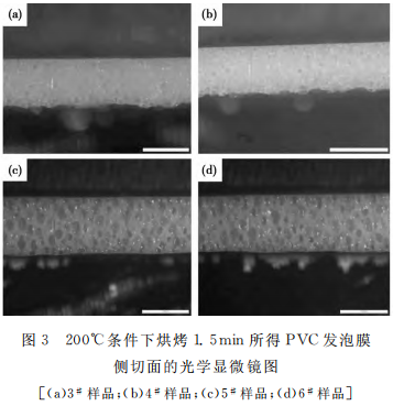 200℃条件下烘烤1.5min所得PVC发泡膜侧切面的光学显微镜图见图3。由图可以看出,生物基PVC发泡膜与石油基PVC发泡膜的发泡情况大致相同,但物理发泡情况总体来说不如化学发泡充盈饱满。