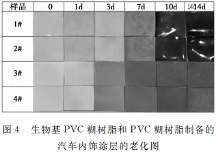 图4为生物基PVC糊树脂和石油基PVC糊树脂制备的汽车内饰涂层的老化图。从图可知,在120℃环境下分别放置1d、3d、7d、10d、14d后,2种树脂制备的汽车内饰涂层的老化情况高度相似,涂层的颜色变化大致相同,可以判断2种树脂的老化性能相同。