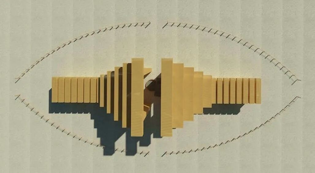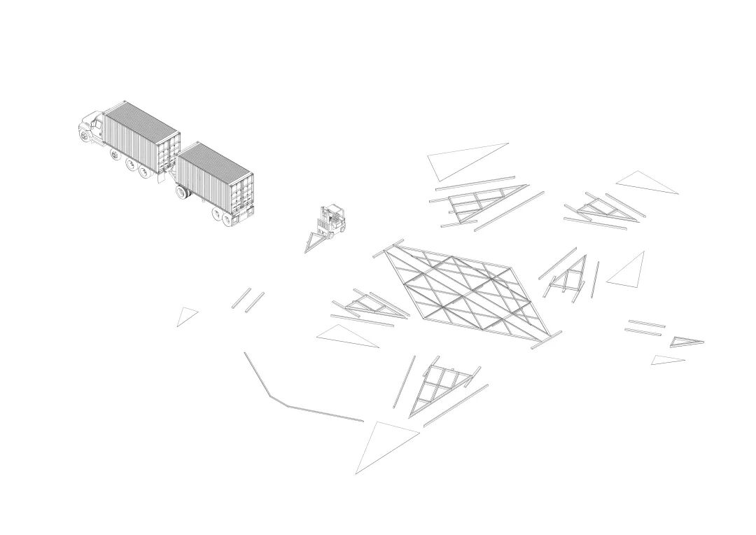 三角形桁架从地面开始横跨以创建一系列朝向结构中心的螺旋路径,而中心将展示巨大的3D打印的曼陀罗。桁架之间的空间足够宽敞,可当作凹室使用。