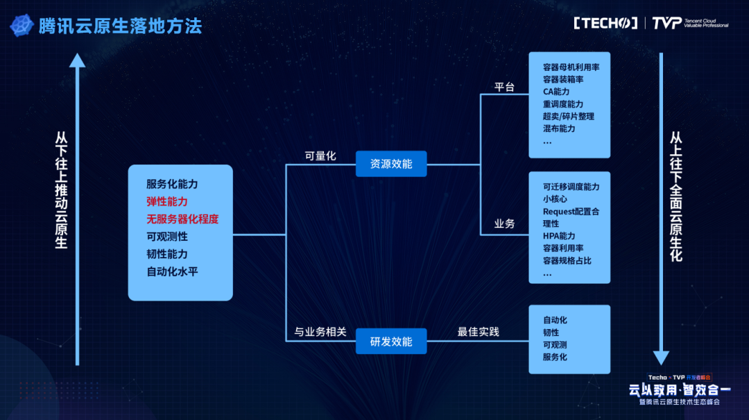 腾讯云原生的落地方法是“从下往上”和“从上往下”两条路并举的方式,前者通过底层技术基础设施的构建,提供云原生化底座,后者通过设立研发效能、资源效能两项指标的方式推动业务的降本增效。