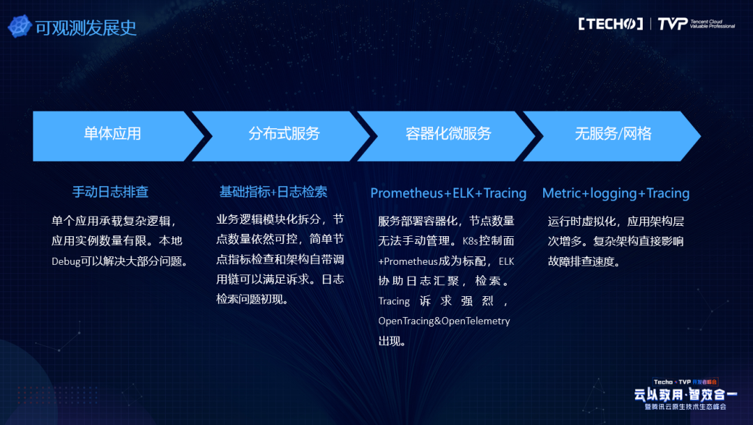 分享伊始,罗嘉黎老师为我们介绍了可观测的发展史,他表示,可观测是随着服务架构的演变而演变的,从早期单体应用时期的手动日志排查,到分布式服务的基础指标+日志检索方式,再到无服务器/服务网格时代的Metric+logging+Tracing。