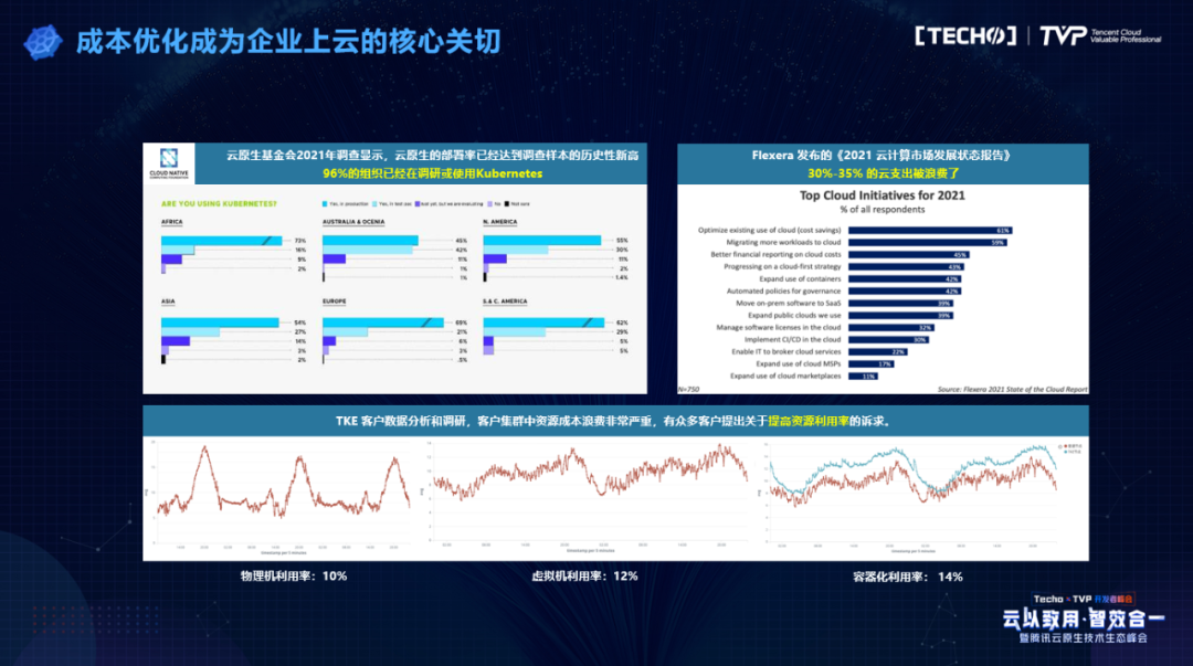 “在云原生无处不在的现状背后,隐藏着云成本存在较大浪费的另一个问题”。孟凡杰老师在开场之初,给出了另一个输入。根据Flexera发布的《2021 云计算市场发展状态报告》,数据显示30%-35%的云支出被浪费了,没有产生任何价值。腾讯云通过客户数据分析和调研发现,客户集群中资源成本浪费非常严重,有众多客户提出关于提高资源利用率的诉求。