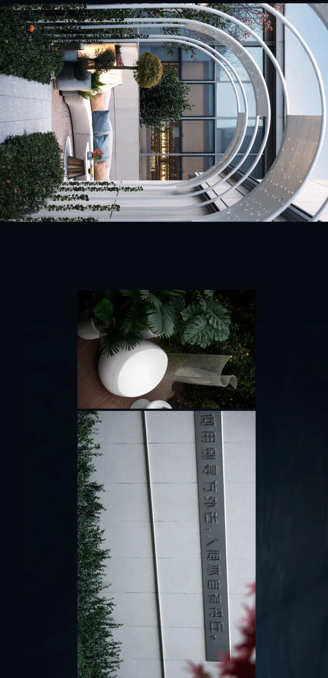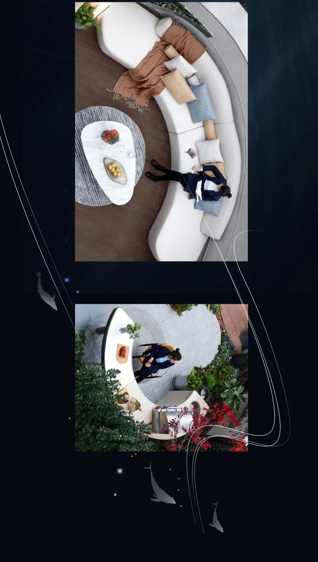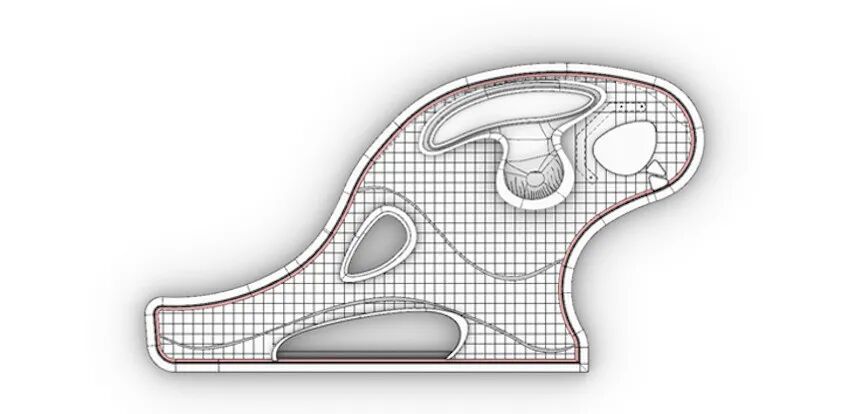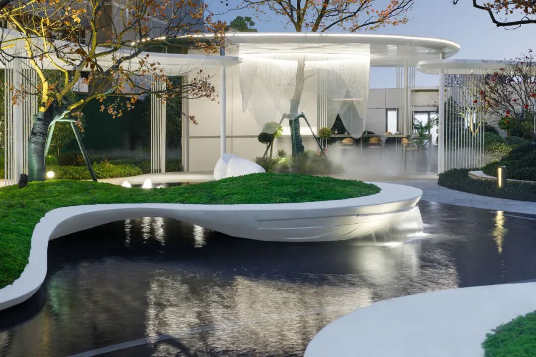 鲸鱼岛作为进入后场的第一视觉呈现,神秘且富有格调,化身为孤岛的鲸,诉说这后场空间的格调和氛围。异形的弧面增加了施工过程的难度,我们通过数据分析参数化辅助设计,指导厂家生产加工。结合施工图可视化,全角度指导工人加工,从而最大程度的还原设计本身,保证项目的完美落地。