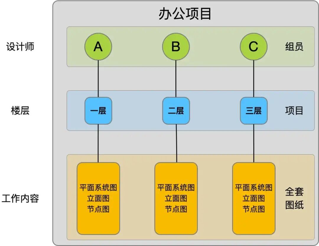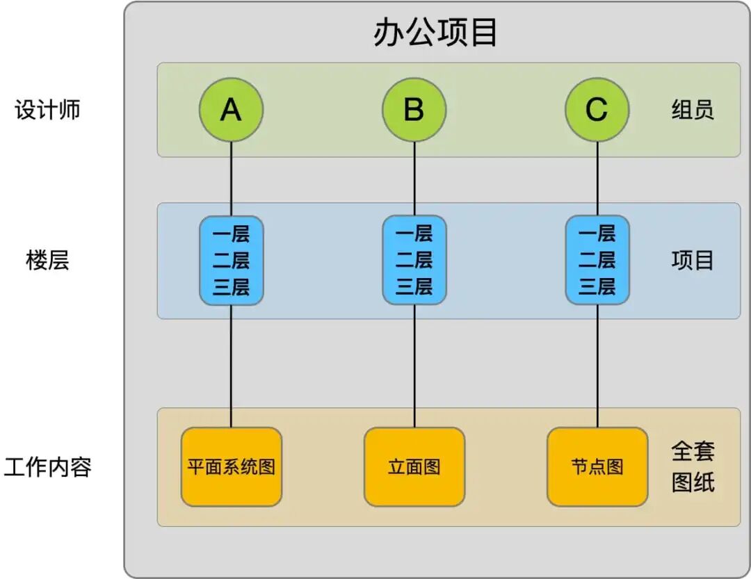 我们也可以采用把不同类型的图纸分配给不同的设计师去完成的方式。这里的图纸类型,就是我们常说的平面系统图、立面图、节点图以及表单类图纸。