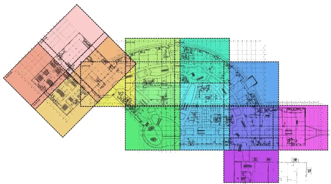 2)面积非常巨大,无法按照建筑形态和功能进行区域放大,可以采用均匀分配的方式进行放大。如下图:这是1个单层面积接近6万㎡的商业平面总图,建筑形态完整,功能也相对单一,我们只能比较均匀的切分成15个区域进行放大。
