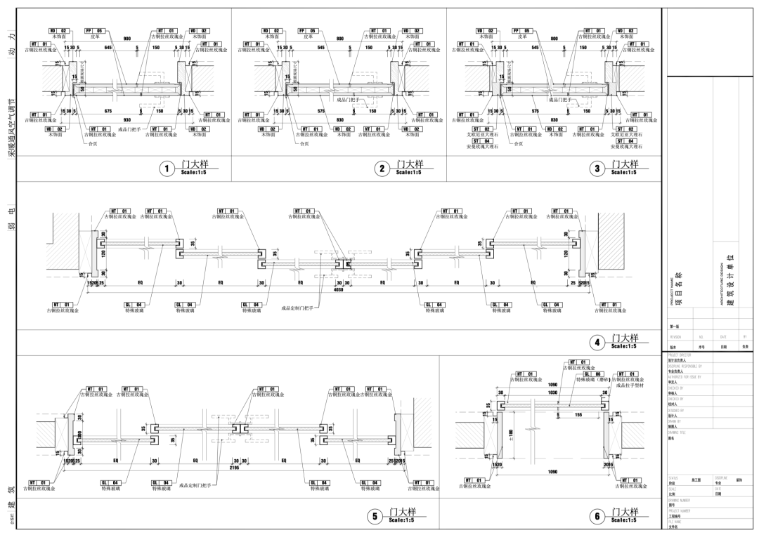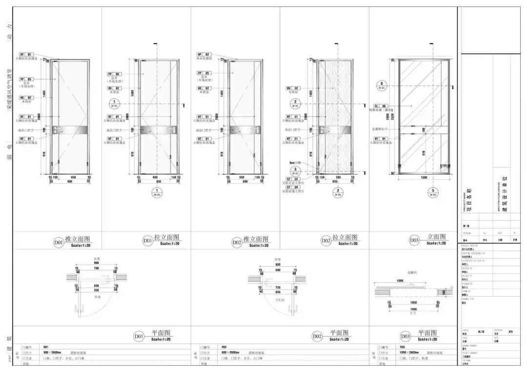 门表格式的选择,主要是取决于项目中门的数量多少。当1个项目中门的种类和数量较多时,可以在1张图上整合多个类型的门,并表达门的平、立面形式,门的节点则索引到独立的门节点图纸表达。