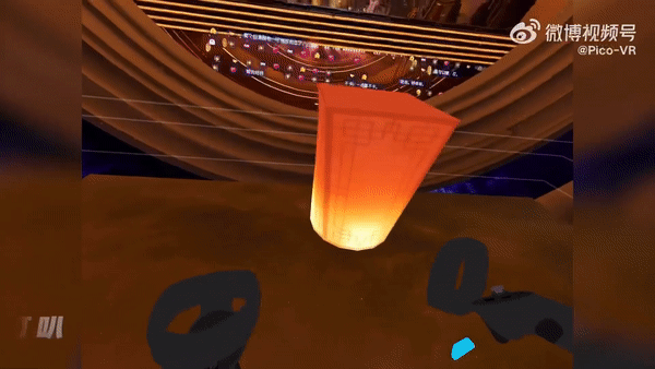 互动性强,也是Pico直播的亮点之一。我们左手呼出菜单,可以发送内置弹幕或者比心等表情包,用户发送的内容可以在舞台下方实时显示出来。