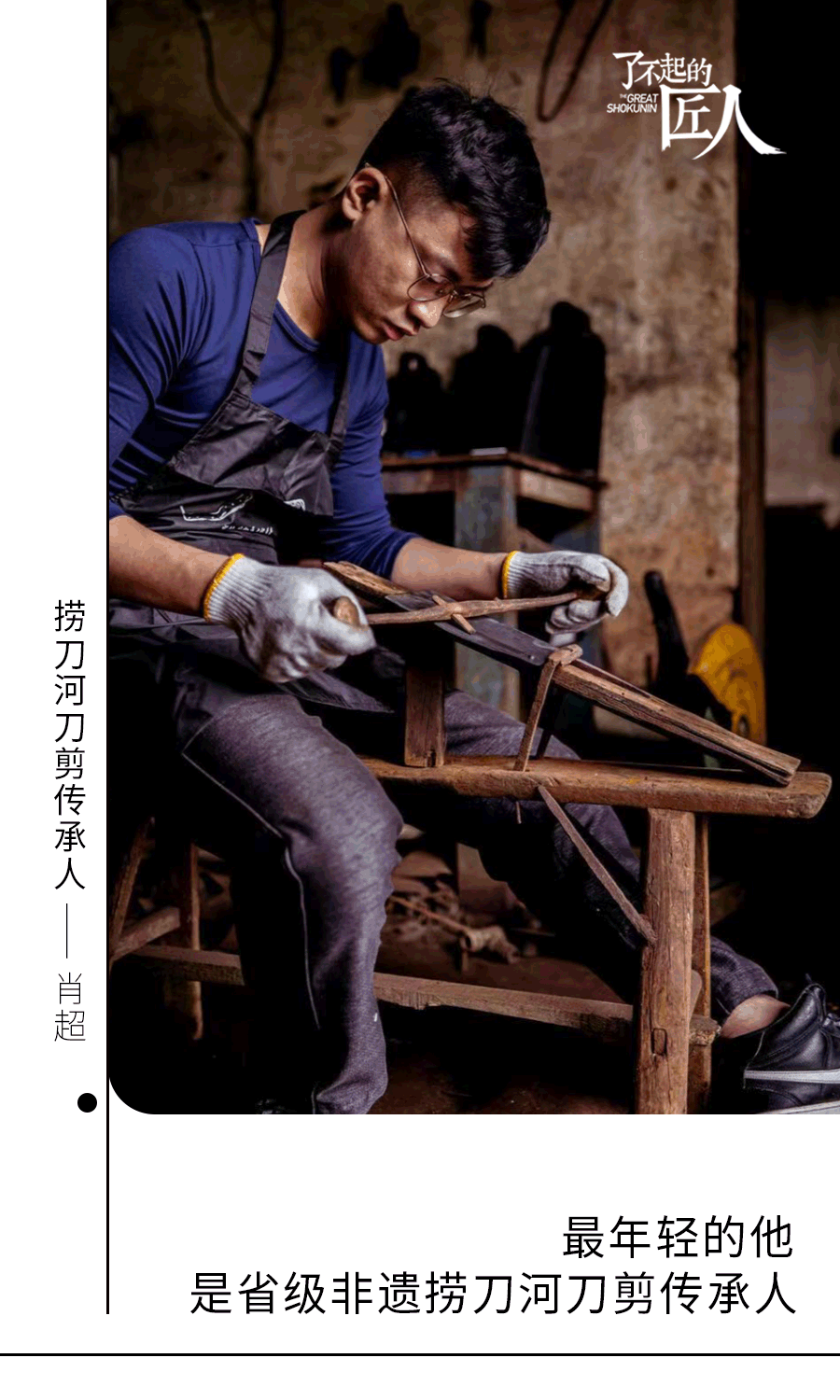 而肖超是唯一一位全心投入在捞刀河制刀工艺的95后,27岁的他成了捞刀河刀剪技艺最年轻的传承人。
