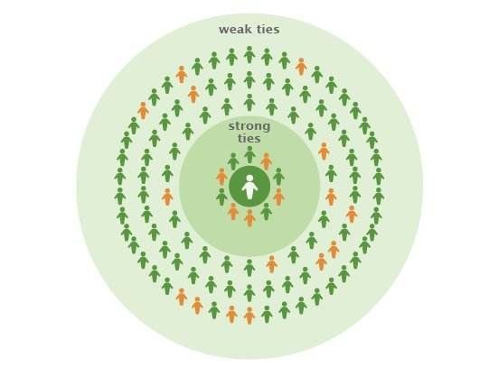 在俄克拉荷马城的创新区里对员工和学生进行的一项调查中发现:三分之二的偶然的社会互动来自于一个共同的熟人,表明在促进新的社会关系中,群体的重要性。