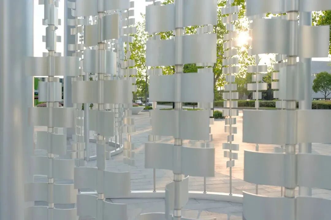 风动片与风动片之间的排列在竖直向或水平向有重叠。当云起风动的时候,风动墙表面不仅有流动变化,还会伴随清脆的声音。