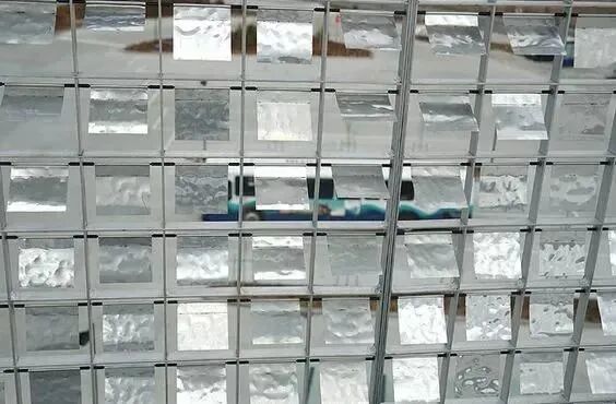 风动幕墙的金属片常规采用90mm~150mm*120mm~180mm*0.6mm~0.8mm,中间构造间隔30mm~50mm,转角处南侧整面布满,西侧调整位置,保证边侧风动片各自不受影响。