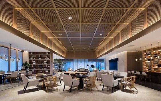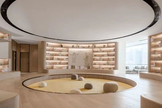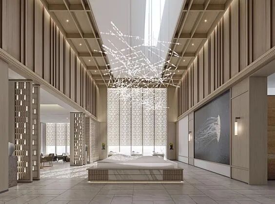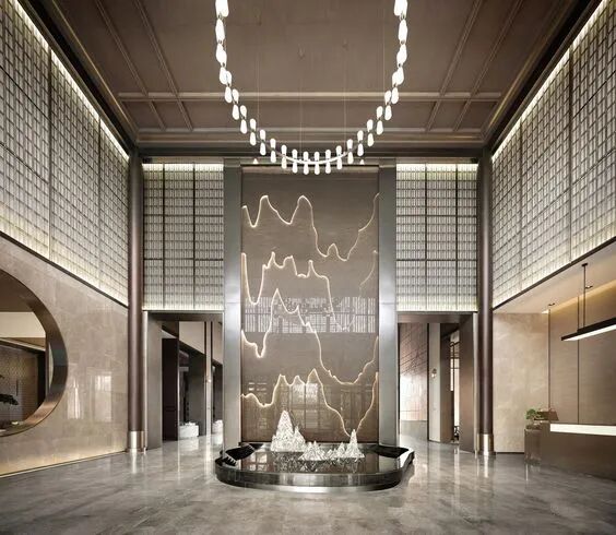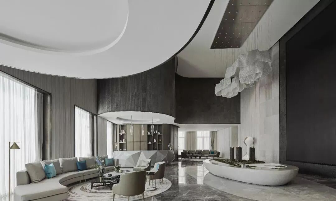 酒店、售楼处这类空间对于材料的选择要求很高。颜色,纹理,质感营造空间的高级感,除此之外消防等问题要严格过审,选材方面特别考验设计师的能力。