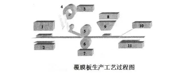 ①金属板表面处理—②金属板输送—③复合膜印刷—④复合膜输送—⑤上膜加压—⑥下膜加压—⑦热复合—⑧废膜修剪—⑨复合质量监测—⑩废膜回收—⑪复合板卷收
