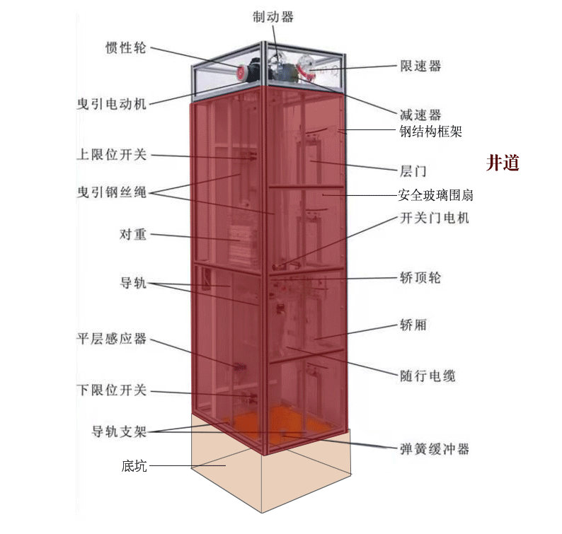 主要由井道结构主体(钢结构框架)、井道壁(围扇)、层门、井道设备等组成。