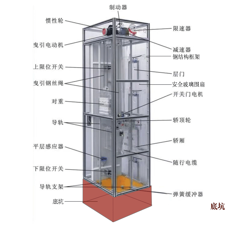 简单来说,观光电梯大体可以分为底坑、井道、轿厢、主机设备层及其他相关部件。