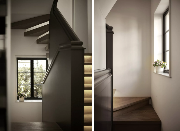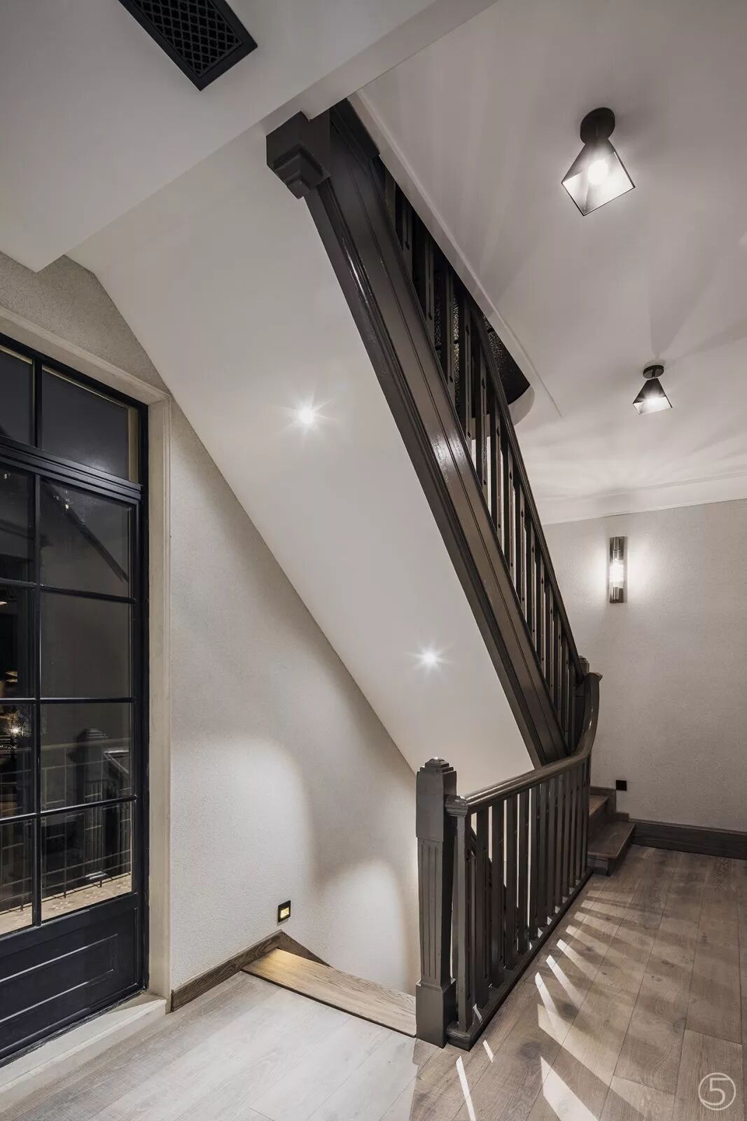回旋楼梯:中西融合——相比于欧式栏杆,比例更为纤细轻巧,柱头采用中式传统样式,而雕花却又融入西方风格。