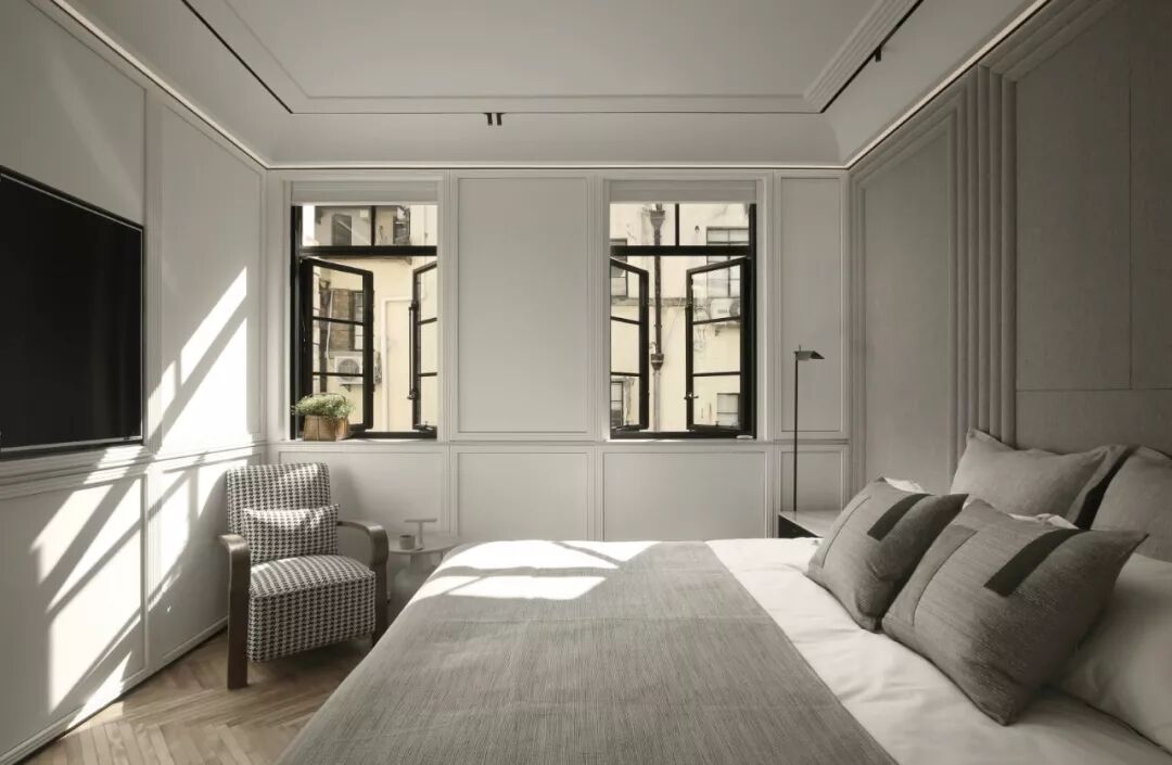 这栋老洋房,原是晚清富商刘学询的产业(刘学询是当年孙中山的投资人),也是上海最早的新式里弄,边上就是旧上海最大的私家花园——哈同花园(现上海展览中心)。设计几乎没有改动老房子的结构布局,还保留了原有的木地板和钢窗,墙面也只是简单刷了漆,所以留住了那份精致的历史感
