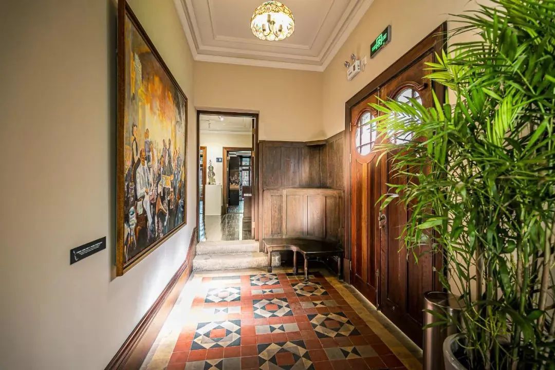 修缮后的荣宅内欧洲复古彩色玻璃与中式实木雕刻并存