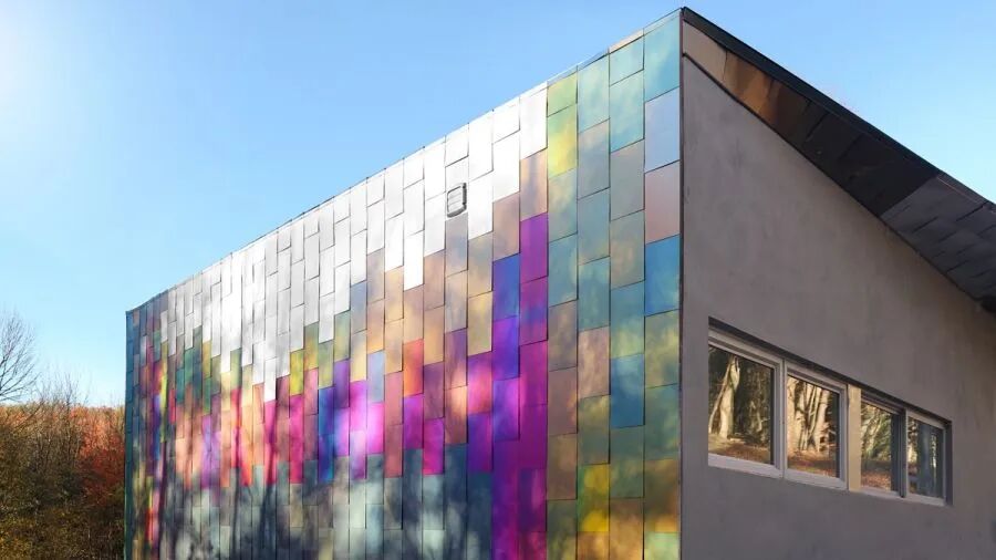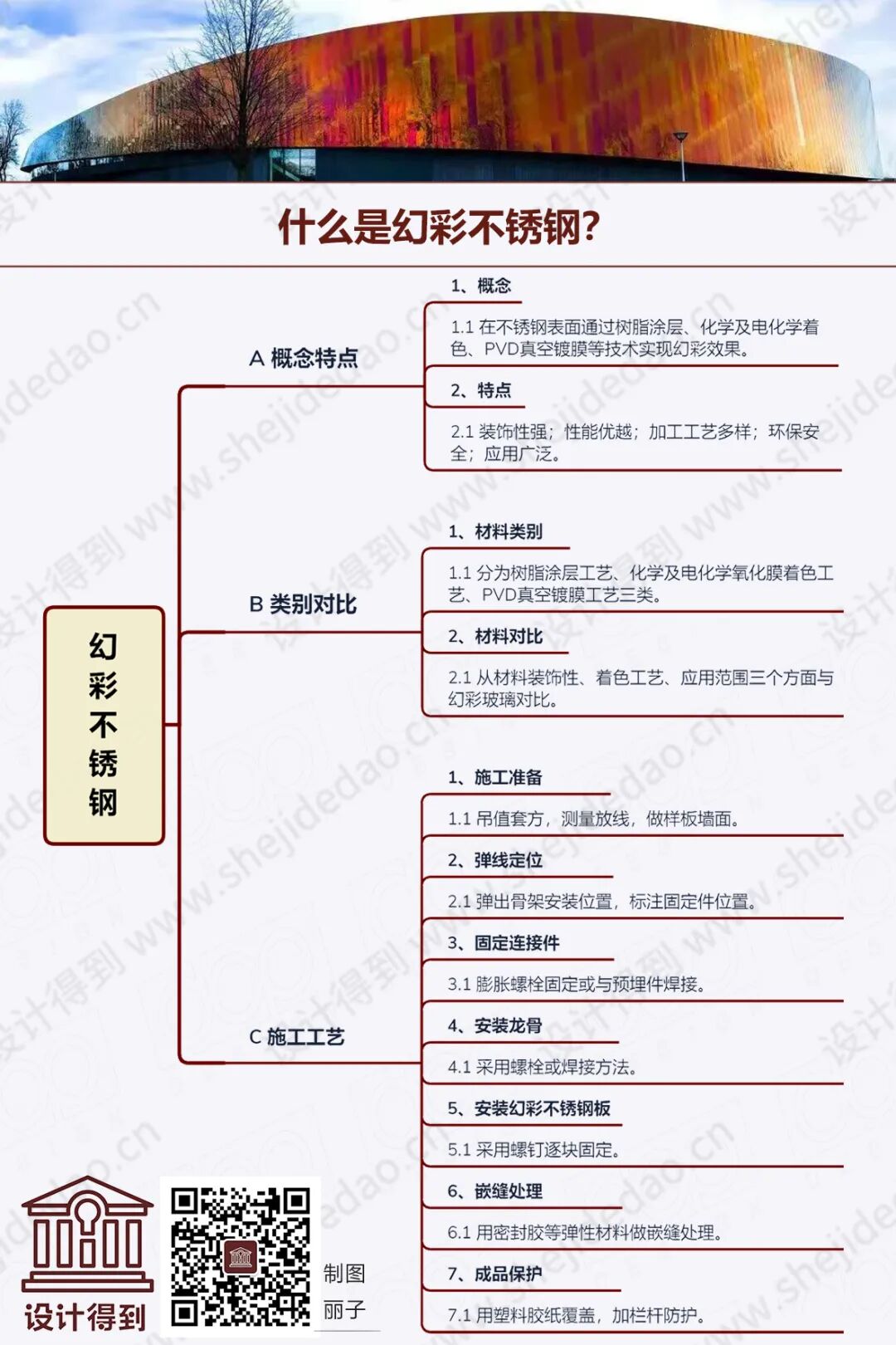 幻彩不锈钢:受基材抛光度、膜层(电解着色液)成分及厚度、环境以及光线入射角影响,呈现出不同的幻彩效果。同时可以呈现出表面具有接近镜面光亮度与质感的效果。