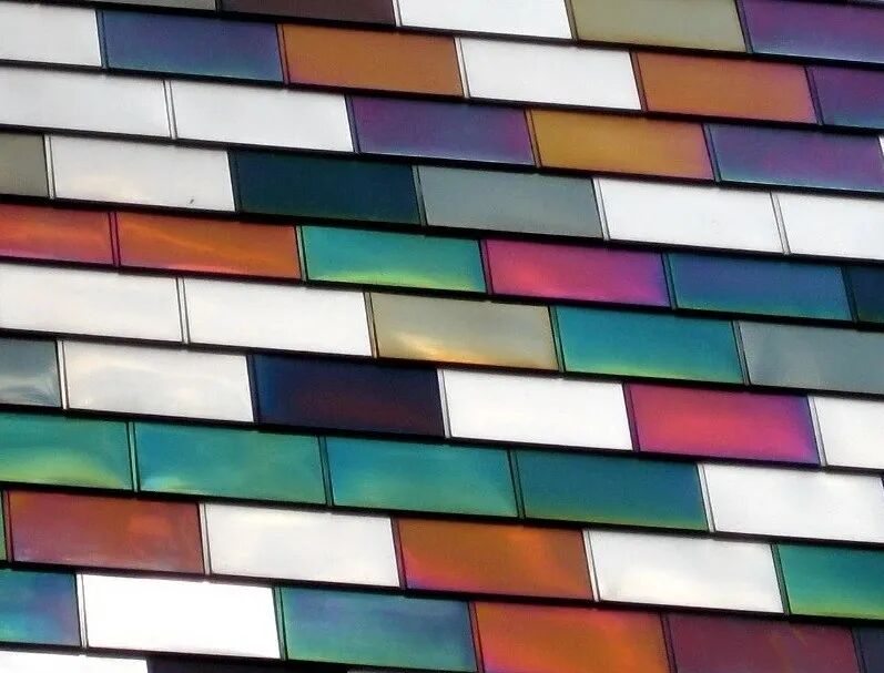 幻彩玻璃:主要通过夹膜工艺作为着色工艺。夹膜工艺指玻璃层压使用两块或更多块玻璃将坚固的PVB膜胶粘在玻璃之间。