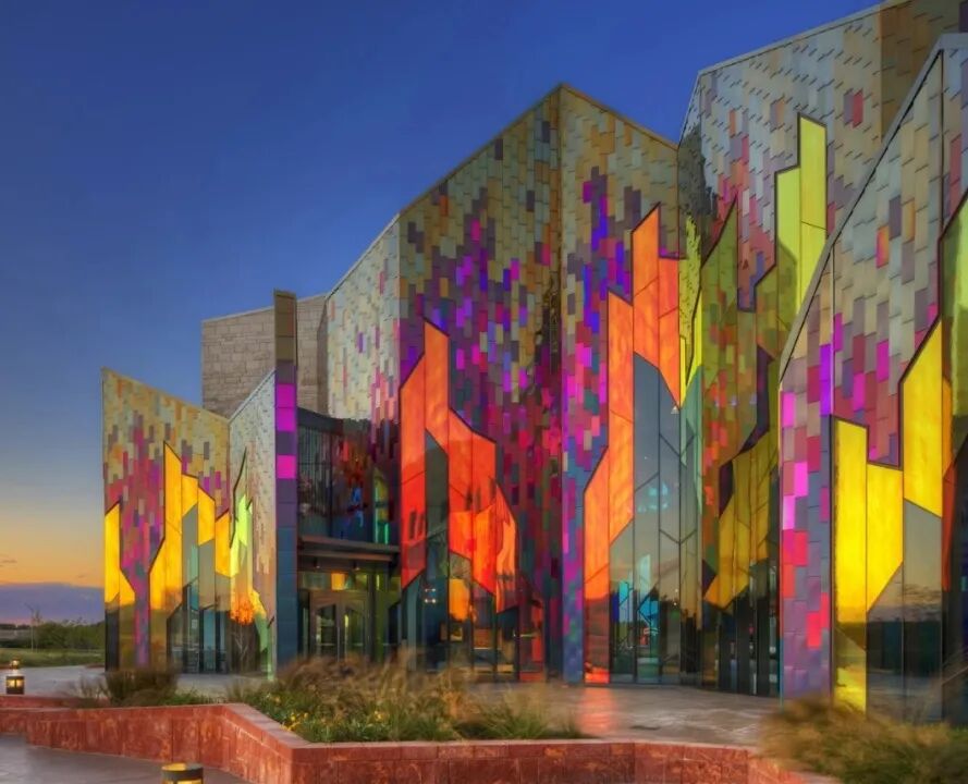 幻彩玻璃:可以制成钢化、夹层、中空等,切割和曲面造型均需工厂预制完成。建筑室内外空间均可应用。