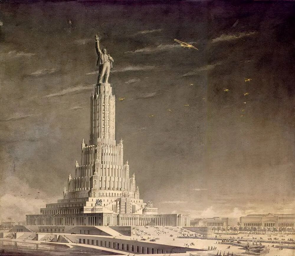 比如,苏联曾经计划建造的苏维埃宫殿,方案只有一个要求,就是要高,要大,要强,作为新苏维埃国家的权力象征,成为世界共产主义的中心,体现社会主义苏维埃的伟大和光荣。这座316米的宫殿以100米的列宁雕像作为皇冠,建筑面积为11公顷,重量为50万吨。高度超过当时世界上所有的建筑,包括美国的帝国大厦。就连顶部的列宁雕像也远远高于美国的自由女神,这一切都令当时的苏维埃政府非常满意。
