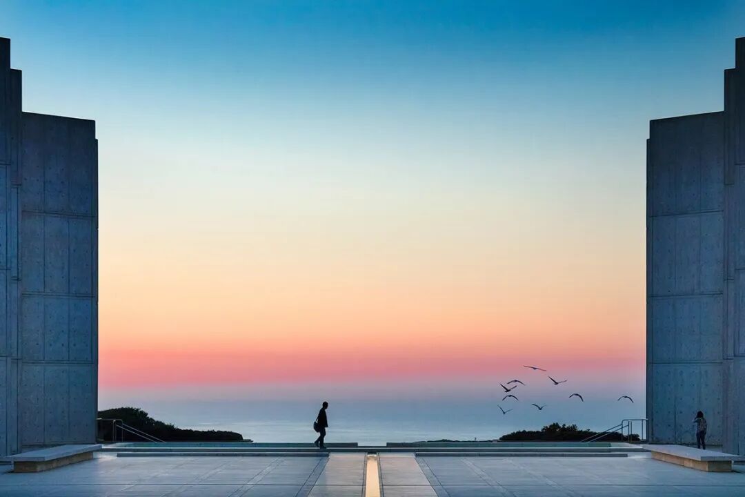路易斯·康在康萨尔克生物研究所设计中在研究塔楼之间设计了一个白色石灰石铺就的广阔空间。研究所墙体的清水混凝土色彩与广场石灰石颜色近乎一致,康认为这种结合让这座建筑有了古老、沧桑的感觉。这种近乎纪念碑式的“废墟场景”的确能让参观者体会到严肃气氛带来的心理压力。薄水渠将广场一分为二,将人们的视线引导至远处地平线的大海。人们接近漫长而严肃的广场尽头时,便能看见远处的海面和绿树,经过广场造成的压抑心情这时得到了释放,完成了崇高感的体验过程。