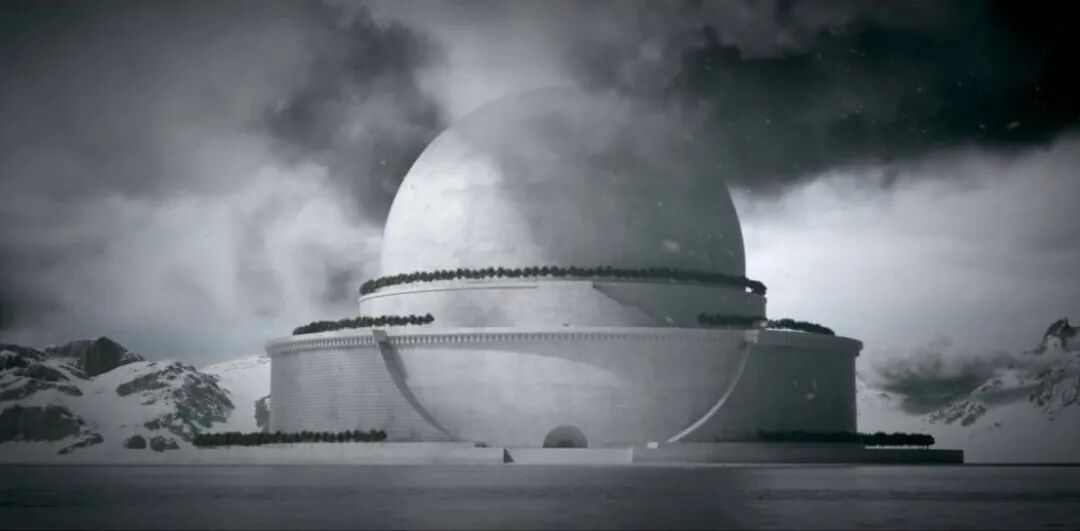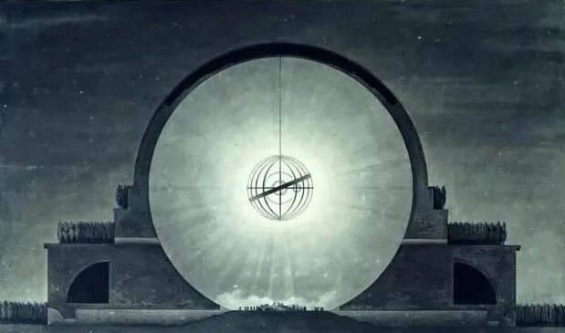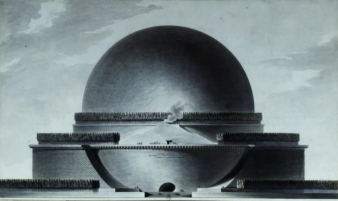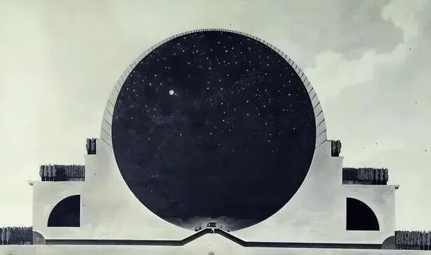 对于强大对象的崇拜除了通过巨大的体量表达往往还可以利用根植于人类基因中对未知自然的崇拜。其中,宇宙可以说是未知自然规律的最佳代表。比如18世纪法国建筑师布雷设计的牛顿纪念堂就通过表达宇宙的广袤和伟大来纪念牛顿。