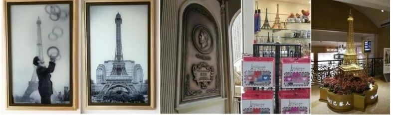 在澳门巴黎人赌场酒店中,我们可以发现法国原版的埃菲尔铁塔照片以及酒店前仿造的缩小版埃菲尔铁塔,埃菲尔铁塔设计者古斯塔夫·埃菲尔的纪念铜版画,纪念品商店中各式各样的埃菲尔铁塔模型,以及埃菲尔铁塔主题的休息座椅。