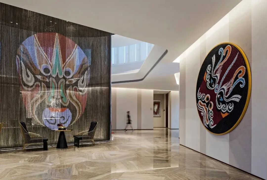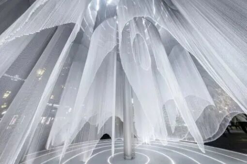 为了实现半透明的轻盈感,材料上选用了金属网作为新型材料