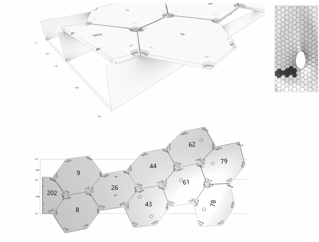 通过图形均布算法将六边形网格单元构件进一步优化至0.9~1.12㎡,使得过大与过小的单元构件尺寸更趋于统一,为后续工厂加工套材提供了便利。