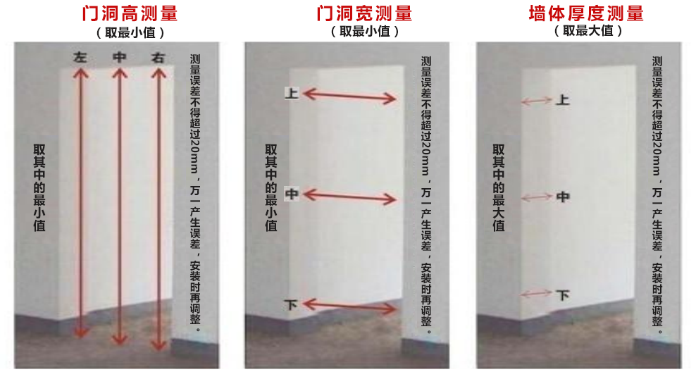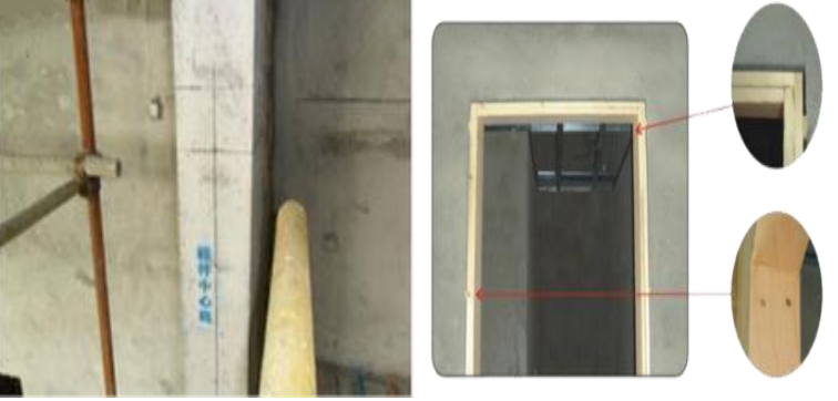 ② 检查门口尺寸是否正确;边角是否方正,有无窜角,检查门口高度应量门的两个立边,检查门口宽度应量门口的上、中、下三点,并在扇的相应部位定点划线。