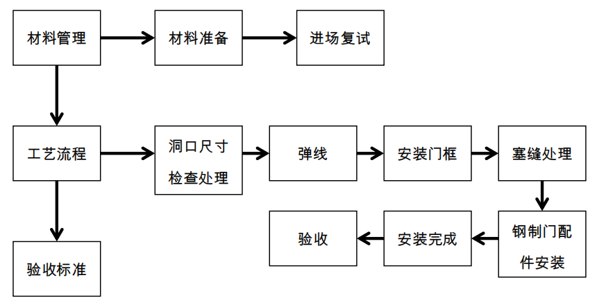 钢质门采用后塞口施工,安装前先检查门窗洞口尺寸是否比门窗框尺寸大 30mm,否则应进行剔凿处理。