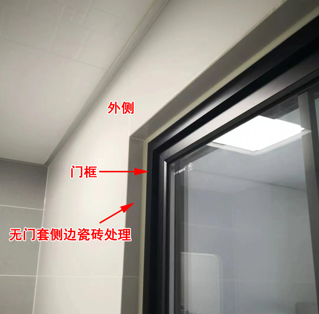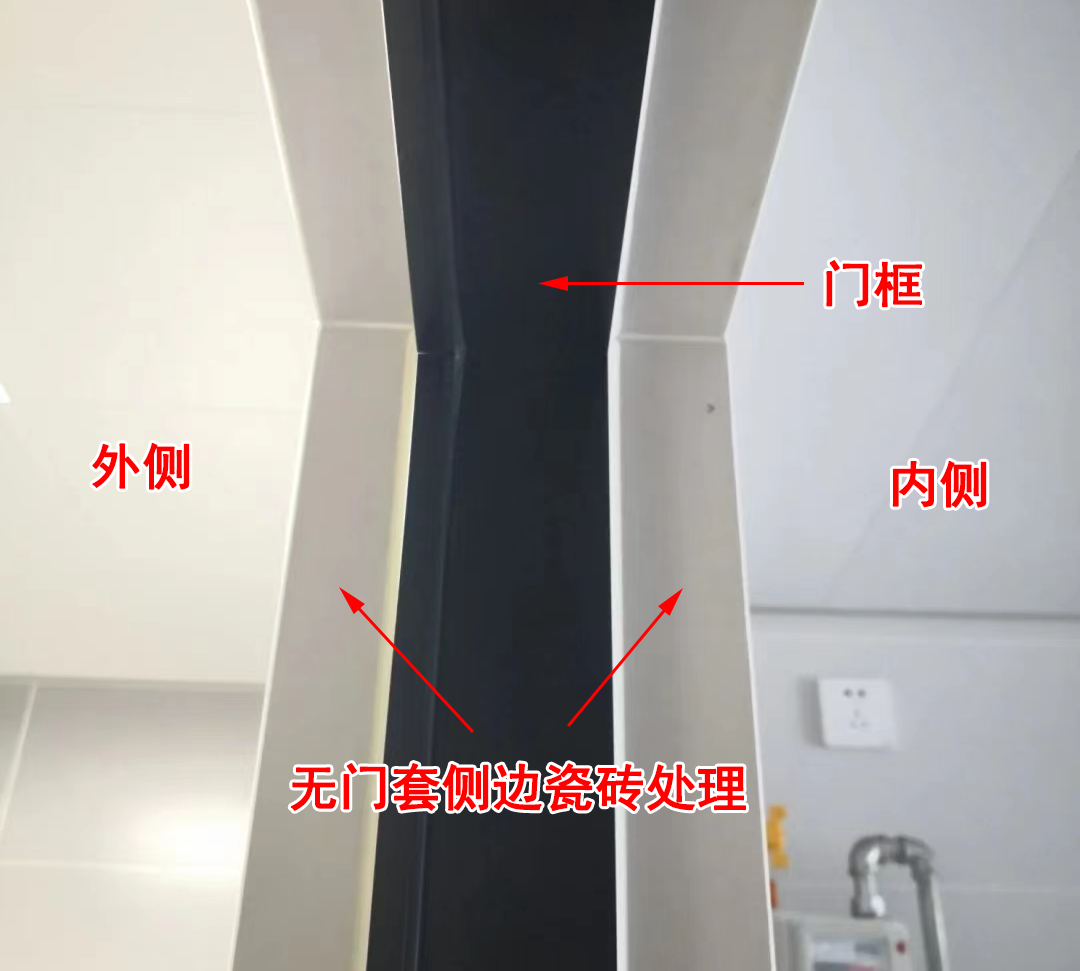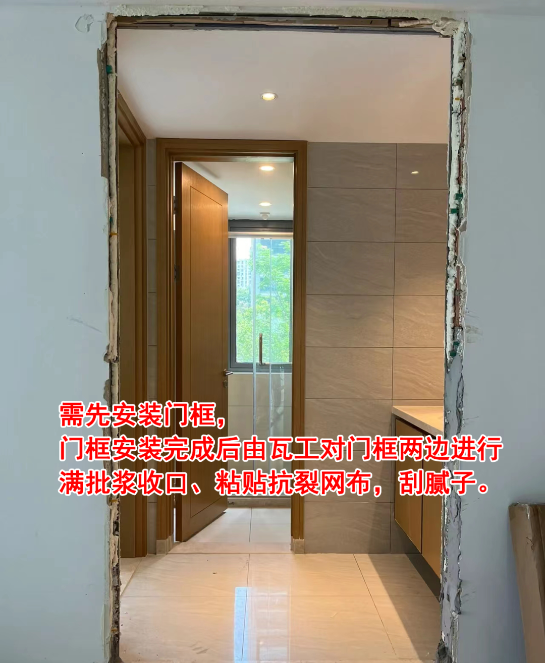卫生间、厨房墙面贴砖的、需先安装门框,门框安装完成后由瓦工进行粘贴瓷砖收口。